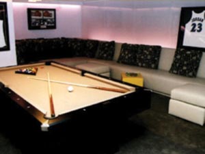 The decor of 40/40 is a mix of memorabilia from this country's greatest games coupled with Manhattan sophistication. Seven chairs suspended from the ceiling transcend guests from a sports bar to a lavish lounge in a matter of seconds. Lush purples and charcoal glazing adorn the walls while rich slate, imported from South America make up the flooring, bars and tabletops. The 16 ft. wide steel stairs and furniture were all produced in Marcy Place, Jay-Z's childhood neighborhood. 40/40 is accented by over 300 pillows that were designed by owner Juan Perez's childhood friend's mother and handcrafted in her home in Washington Heights.